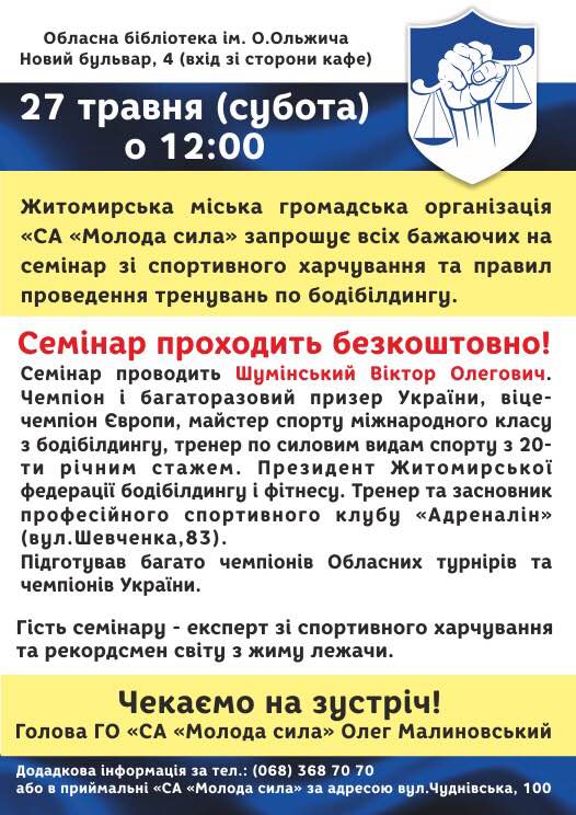 ГО "СА"Молода сила" запрошує всіх бажаючих на семінар зі спортивного харчування та правил проведення тренувань по бодібілдінгу.