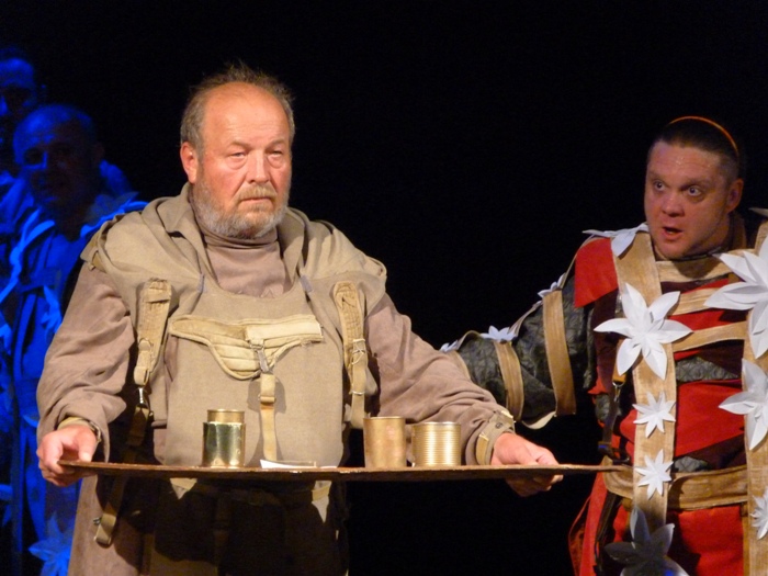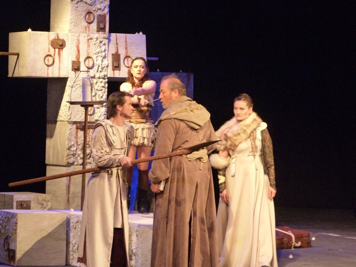Режисер Петро Авраменко постав і як режисер-драматург, і як сценограф, і як дизайнер костюмів. Він не лише здійснив драматургічну переробку тексту п’єси, а й виступив як автор текстів пісень-сонгів, у яких закарбована його мистецька і громадянська позиція. Глибокі за філософським звучанням сонги , чітко (навіть – жорстко) виписана партитура метафоричних сцен, епізодів, образів; напрочуд талановите оранжування пісень (О. Кривошея) – все це стало основою для виявлення художньої волі режисера та його світобачення, його філософії буття. Цьому ж сприяє і лаконічна мова режисера-сценографа. Основою творення образної системи вистави є каміння, яке набуває у режисера багатозначного звучання і потрактування. З каменю складено стіни монастиря і могилки померлих, каміння діє як руйнівна зброя і як основа для фундаменту будівель. А, отже, постає як сутнісне наріжне питання: хто є людина? Будівничий чи руйнівник? І для чого людина живе? Щоб зводити храми, чи їх руйнувати? Камінь перетворюється на наскрізну метафору вистави, яка є багатогранною і багато значущою. Вона вимагає роздумів і прийняття рішення. Перш за все – для себе. Глядачеві ж лишається визначити своє ставлення до цієї метафори, а, отже, зробити свій власний вибір – у житті!