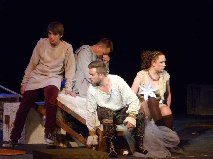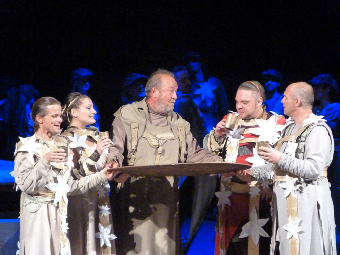 У відповідності до задуму режисера-постановника у виставі відбулися яскраві акторські прочитання ролей. Глибиною проникнення у філософську концепцію вистави позначені акторські роботи О. Шкарупи, Д. Зіневича, О.Заведії, М.Карповича, і, перед усім, – В.Рогутського. Запам’ятовуються образи, що створені С.Роговим, М.Варфоломєєвим, Г. Кутішенко, О.Слабченко, М. Петрівським, О.Шерпельовим, А.Доманським, Д.Кокарєвим, В.Кіпчуком, М.Лабознюком, С.Артеменком, О.Литовченком, О.Роговим. І навіть після закінчення вистави продовжують звучати в розбурханих душах глядача сонги у блискучому виконанні С.Поліщук та А.Глущука. Відбулися чудові відкриття нових для Житомирської сцени акторських імен – дебютантки О. Луць та наймолодшого учасника вистави, учня Житомирської школи № 32 – Володимира Номеровського. У них попереду, як, втім, і у всіх творців акторського ансамблю, хочеться вірити. – щедре на відкриття і здобутки творче життя, якщо не забуватимуть просту істину : талант – це не лише дар, але й виснажлива праця. А ще – великодушність і любов до людей. І окрім цього – звичайна вдячність тим, хто йде попереду, торуючи дорогу іншим…