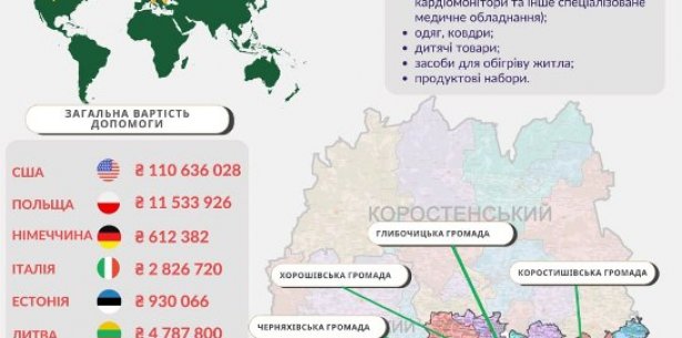 Як зазначив начальник Житомирської ОВА Віталій Бунечко, 8 громад Житомирського району мають партнерські відносини з муніципалітетами з 6 країн: Польщі, Естонії, США, Німеччини, Італії та Литви. За інформацією, наданою територіальними громадами в рамках співпраці з містами-побратимами вони отримували медичне обладнання, генератори, харчові продукти засоби обігріву та інше.
