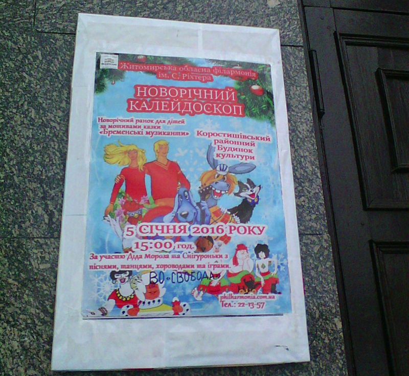 Коростишів, новини - 5 січня в Коростишеві відбувся Новорічний Благодійний концерт «Бременські Музиканти». На сцені районного будинку культури глядачів розважали артисти Житомирської обласної філармонії імені С. Ріхтера. Концерт відбувся за фінансової підтримки приватного підприємця Сергія Шунєвича. Організатори заходу мали на меті привітати коростишівців з новорічними святами та наступаючим Різдвом Христовим, а також зібрати кошти для військових АТО.