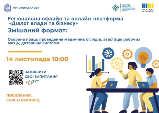 14 листопада за дорученням начальника Житомирської обласної військової адміністрації Віталія Бунечка, під головуванням його заступниці Наталії Арендарчук відбулася онлайн-зустріч керівництва та представників бізнесу області в рамках платформи “Діалог влади та бізнесу” на тему: “Охорона праці. Проведення медичних оглядів, атестація робочих місць, дозвільна система”.