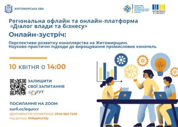 10 квітня о 14:00 у рамках проєкту «Діалог влади та бізнесу» відбудеться чергове засідання на тему: «Перспективи розвитку коноплярства на Житомирщині. Науково-практичні підходи до вирощування промислових конопель».