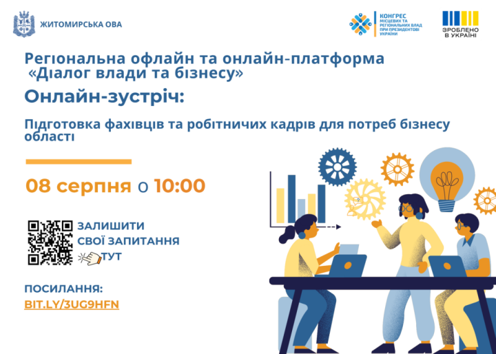 08 серпня о 10:00 у рамках проєкту «Діалог влади та бізнесу» відбудеться чергове засідання на тему: «Підготовка фахівців та робітничих кадрів для потреб бізнесу області».