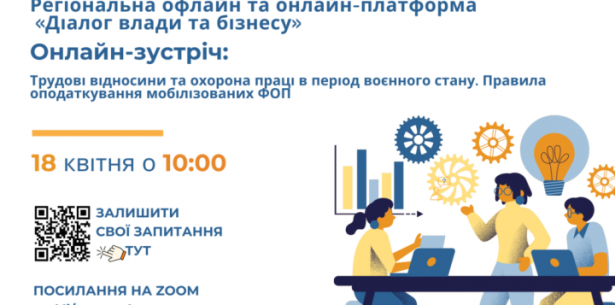 18 квітня о 10:00 у рамках проєкту «Діалог влади та бізнесу» відбудеться чергове засідання на тему: «Організація трудових відносин і охорона праці на підприємствах усіх форм власності в період воєнного стану та нові правила оподаткування мобілізованих фізичних осіб підприємців».