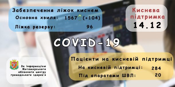 Станом на 14 грудня за даними Комунального некомерційного підприємства “Обласний центр громадського здоров’я” Житомирської обласної ради у лікарнях, які внесені до переліку закладів охорони здоров’я, що визначені для госпіталізації пацієнтів з гострою респіраторною хворобою COVID-19, спричиненою коронавірусом SARS-CoV-2, з 2525 ліжок забезпечено киснем 1567. У лікарнях резерву з 161 ліжка, визначеного для госпіталізації пацієнтів з підтвердженим випадком COVID-19, забезпечено киснем 96 ліжок.