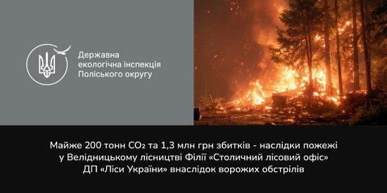 Державна екологічна інспекція Поліського округу здійснила розрахунки розміру шкоди, завданої неорганізованими викидами забруднювальних речовин в атмосферне повітря внаслідок пожежі, що виникла через ворожі обстріли 3 вересня 2025 року на території філії «Столичний лісовий офіс» ДП «Ліси України» (Словечанське надлісництво, Велідницьке лісництво, Коростенський район, поблизу села Чабан).