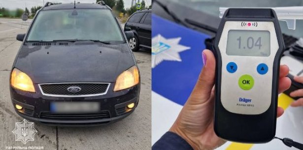 Спілкуючись з керманичем виявили ознаки алкогольного сп'яніння. Він погодився пройти освідування на місці. Результат позитивний — 1,04 проміле.