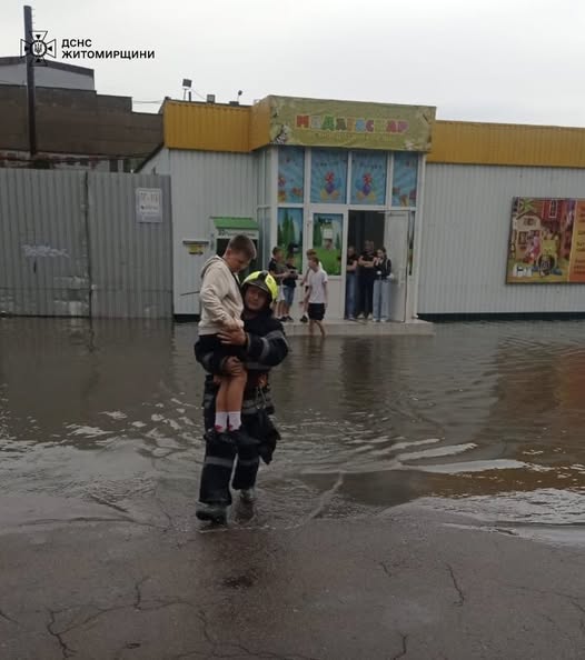 Окрема увага — відкачці води з підтоплених територій. У приватних домоволодіннях рятувальники відкачали вже понад 312 куб. м води. Роботи тривають — наразі наші хлопці відкачують воду поблизу одного з магазинів у Звягелі.