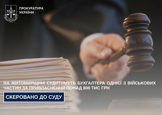 Прокурорами Житомирської спеціалізованої прокуратури у сфері оборони Центрального регіону до суду скеровано обвинувальний акт стосовно бухгалтера однієї з військових частин Житомирщини за фактом привласнення майна в особливо великих розмірах в умовах воєнного стану, легалізації майна, одержаного злочинним шляхом, складання та використання підроблених документів (ч. 5 ст. 191, ч. 1 ст. 209, ч. 2 ст. 358 КК України).
