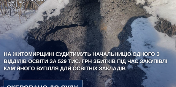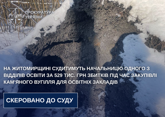 Ювенальні прокурори Коростишівської окружної прокуратури скерували до суду справу стосовно начальниці відділу освіти, культури, молоді та спорту однієї із селищних рад Житомирщини, яка завдала збитків державі під час закупівлі кам’яного вугілля для освітніх закладів (ч. 2 ст. 367 КК України).