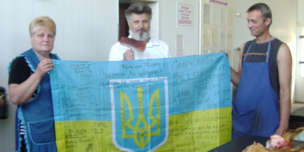 Державний прапор з передової, підписаний військовими, привіз із чергової благодійної поїздки на Схід волонтер Станіслав Станчик. Цей мужній чоловік, не дивлячись на свій досить поважний вік, здійснив більше 80 поїздок в зону АТО.