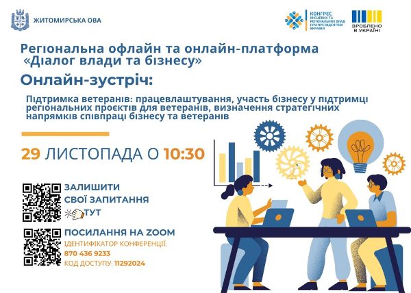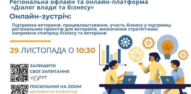 29 листопада о 10:30 у рамках проєкту «Діалог влади та бізнесу» відбудеться онлайн-зустріч на тему: «Підтримка ветеранів: працевлаштування, участь бізнесу у підтримці регіональних проєктів для ветеранів, визначення стратегічних напрямків співпраці бізнесу та ветеранів».