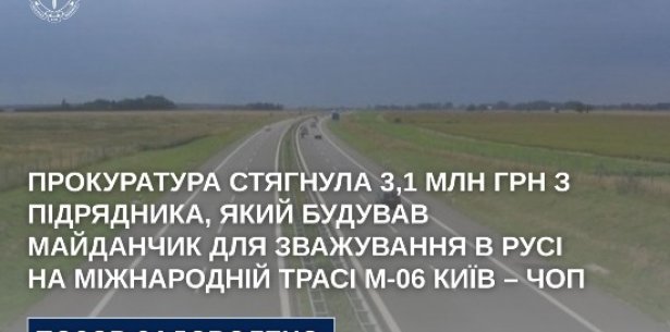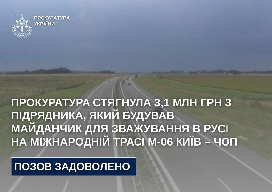 За позовом Житомирської обласної прокуратури до державного бюджету стягнуто 3,1 млн грн з товариства з обмеженою відповідальністю, яке виконувало будівельні роботи по спорудженню майданчика зважування в русі WIM на автомобільній дорозі міжнародного значення М-06 Київ – Чоп.