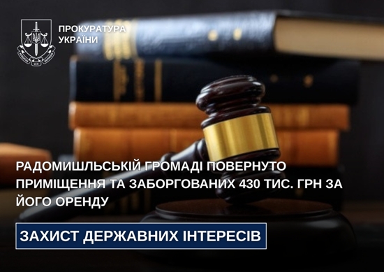 З метою захисту державних інтересів у серпні 2025 року Коростишівська окружна прокуратура подала до суду позов в інтересах держави в особі Радомишльської міської ради та Відділу містобудування, архітектури, житлово-комунального господарства Радомишльської міської ради Житомирської області про стягнення заборгованих 429,1 тис. грн та повернення приміщення законному власнику.