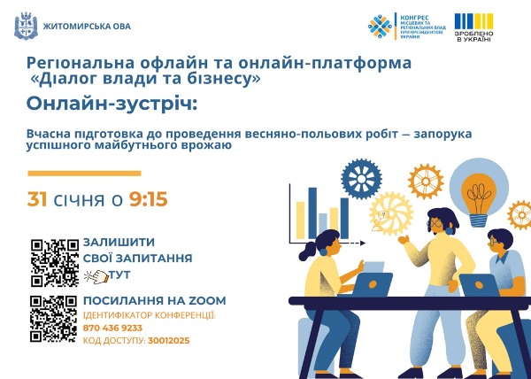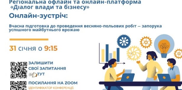 31 січня о 09:15 у рамках проєкту «Діалог влади та бізнесу» регіональний форум на тему: «Вчасна підготовка до проведення весняно-польових робіт – запорука успішного майбутнього врожаю».
