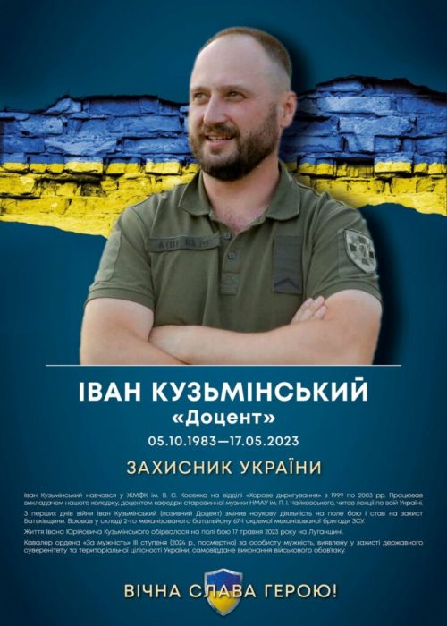 Іван Кузьмінський (позивний «Доцент») — викладач коледжу, доцент кафедри старовинної музики НМАУ;