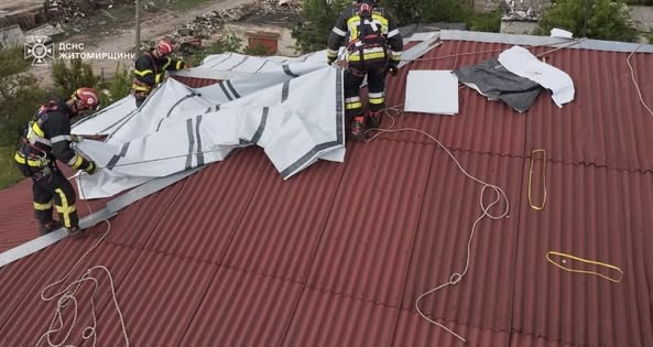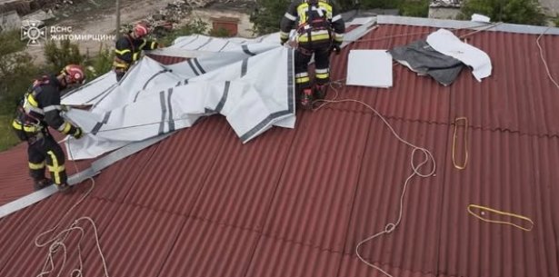 Також робота тривала і у селищі Новогуйвинське. Там рятувальники укріплювали пошкоджені дахи житлових будинків. Кожен дах це захист зверху для людей, тому завдяки зусиллям фахівці ДСНС багато громадян знову можуть почуватися у безпеці у своїх домівках.
