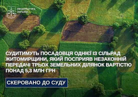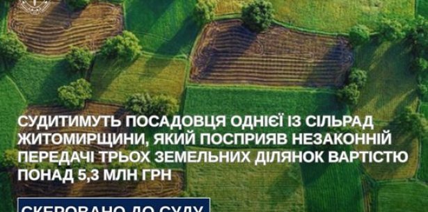 64-річний начальник структурного підрозділу Оліївської сільської ради Житомирського району сприяв незаконній передачі земельних ділянок вартістю 5,3 млн грн у приватну власність.
