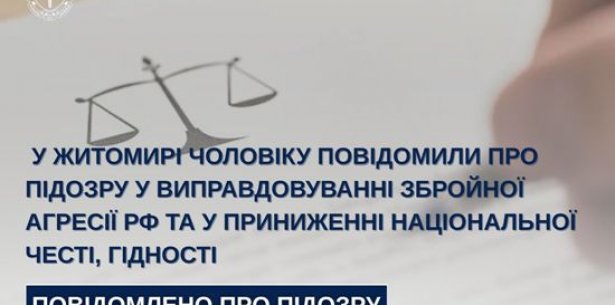 У Житомирі чоловіку повідомили про підозру у виправдовуванні збройної агресії рф та у приниженні національної честі, гідності