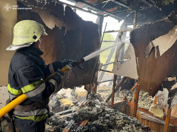 9 травня о 13:56 до Служби порятунку «101» надійшло повідомлення про пожежу в господарчій будівлі, яка поширилась на житловий будинок у Звягелі. По прибуттю бійців ДСНС було вогнем охоплено господарчу споруду та мансарду, впритул розташованого житлового будинку. Ускладнювало процес гасіння те, що будинок був критий жестю. Для підвозу води було залучено ще одне відділення вогнеборців.