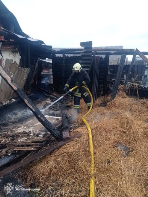 Подія сталася сьогодні вдень у приватному домогосподарств у с. Токарів Ярунської громади Звягельського району. Через віддаленість місця події від пожежно-рятувального підрозділу по прибуттю вогнем вже була знищена половина дерев’яної господарчої будівлі, а інша - повністю охоплена полум’ям.
