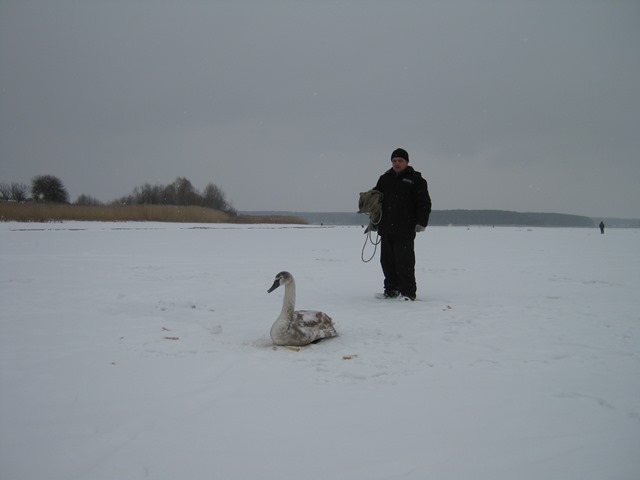 Когда команда Новоборивськоимисцевои пожарной охраны, в составе 3 человек, прибыла на тревожный вызов, то птица действительно сидел на тонком льду примерно через 100 метров от берега и не двигался, только оглядывался вокруг.