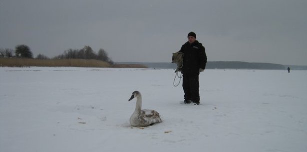 В Житомирской области из замерзшей реки спасали лебедя. ФОТО