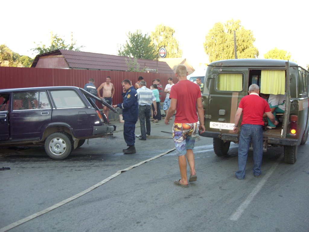 0 20:10 дежурный караул 16-й государственной пожарно-спасательной части уже был на месте происшествия. В центре Радомышль столкнулись автомобили ВАЗ 2104 и спринтер «Dodge». В результате ДТП легковушка въехала в металлический забор, из поврежденного бака вытекало горючее. Для обеспечения пожарной безопасности бойцы ГСЧС развернули рукавную линию, чтобы в случае возможного возгорания оперативно его потушить.