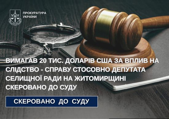 Прокурори Коростишівської окружної прокуратури скерували до суду обвинувальний акт за фактом вчинення кримінальних правопорушень за ч. 2 ст. 15, ч. 4 ст. 190, ч. 4 ст. 27, ч. 3 ст. 369 КК України – замах на заволодіння чужим майном у великих розмірах шляхом обману та підбурювання до надання неправомірної вигоди службовим особам, які займають відповідальне становище.