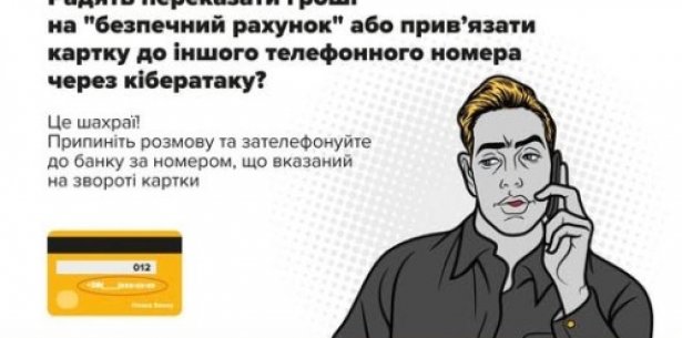 – у разі надходження дзвінка з інформацією про проблеми з вашим фінансовим рахунком, перервіть розмову та особисто зателефонуйте у службу підтримки за номером, вказаним на звороті вашої картки, чи завітайте у відділення банку.