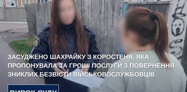 Засуджено шахрайку з Коростеня, яка пропонувала за гроші послуги з повернення зниклих безвісти військовослужбовців