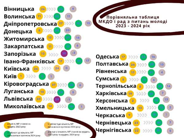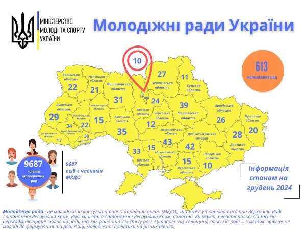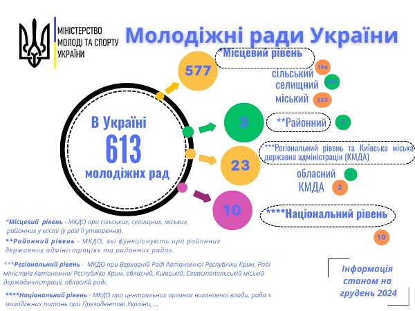 Станом на грудень 2024 року в країні утворено 613 молодіжних рад. За 2024 рік найбільшу кількість рад було утворено у Донецькій (20), Івано-Франківській (17), Житомирській та Одеській (16) областях.