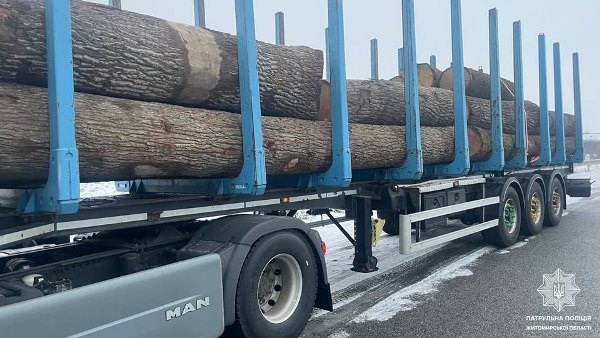 Патрульна поліція Житомирської області продовжує контролювати законність перевезення деревини. Днями на дорожній станції патрульної поліції автодороги Київ — Чоп, патрульні зупинили вантажний транспортний засіб MAN з напівпричепом Zaslaw, водій якого перевозив деревину породи дуб.