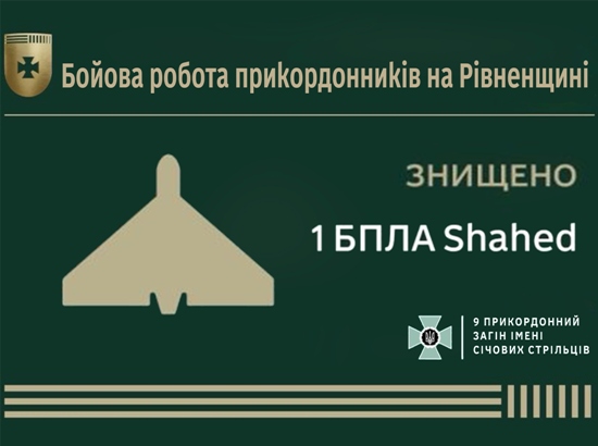 Під час виконання завдань з охорони державного кордону прикордонним нарядом було виявлено та збито зі стрілецької зброї ворожий ударний безпілотний літальний апарат типу Shahed, який летів по повітряному простору України.