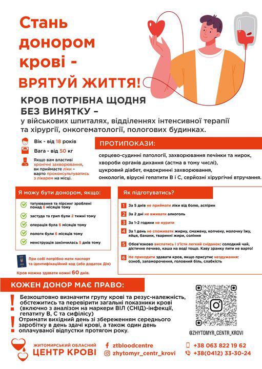 Житомирський обласний центр крові запрошує долучитися до донорства крові на підтримку українських військових