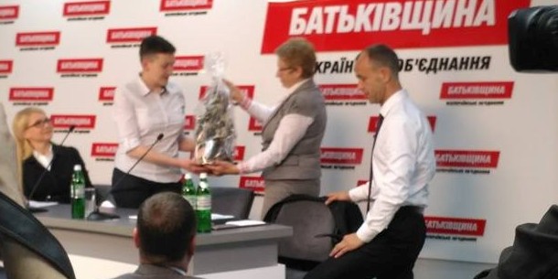 «31 травня на 14 з'їзді партії Всеукраїнського Об'єднання «Батьківщина» Житомирська делегація передала Надіі Савченко оберіг - ляльку-мотанку та подякувала їй за мужність і вірність Україні», - йдеться у повідомленні.