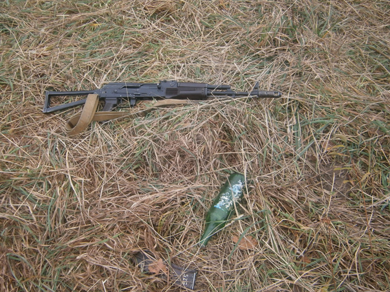 В милицию сообщили местные жители, они заметили пидозрихих человек с оружием. На место происшествия сразу выехала следственно-оперативная группа. В ходе осмотра автомобиля и прилегающей территории правоохранители изъяли боевой автомат АК-74 с присоединенным магазином и патронами к нему в количестве 54 штуки и гранату Ф-1.