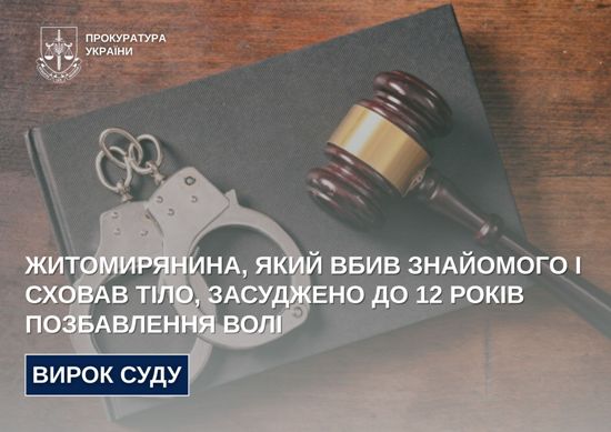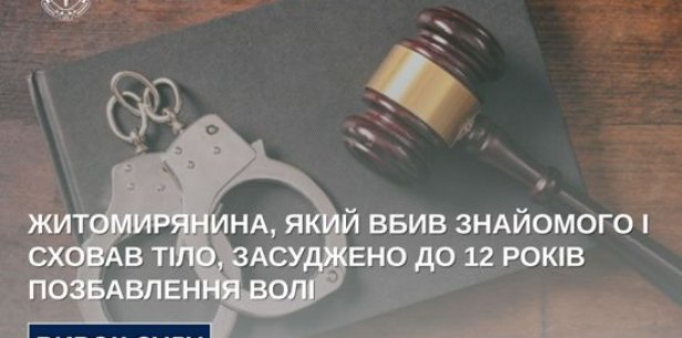 За підтримання публічного обвинувачення Житомирської обласної прокуратури Богунський районний суд м. Житомира визнав чоловіка винним у вчиненні кримінальних правопорушень за ч. 1 ст. 115, ч. 2 ст. 309, ч. 2 ст. 310 КК України та призначив покарання у виді 12 років позбавлення волі із стягненням на користь дочки загиблого 800 тис. грн моральної шкоди.