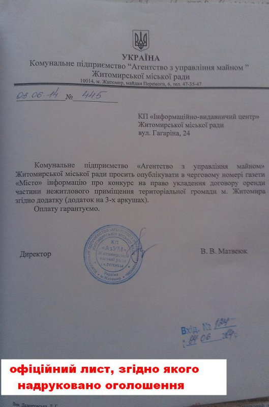 Пане Шуляр, нас глибоко обурила ваша заява на засіданні міськвиконкому 19 червня зроблена у кремлівському стилі про недостовірну інформацію в газеті «Місто» щодо терміну подачі конкурсних пропозицій у «Інформації про конкурс на право укладення договору оренди нерухомого майна територіальної громади м. Житомира», розміщеній у 22 номері газети від 6 червня цього року.