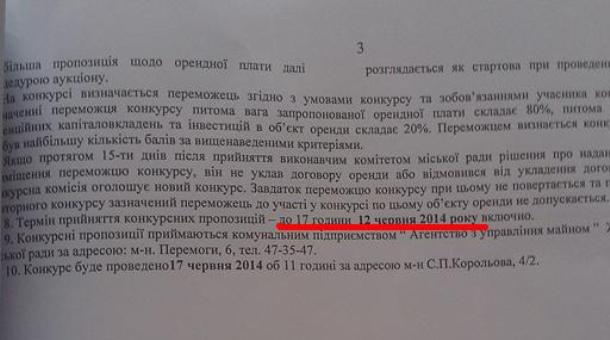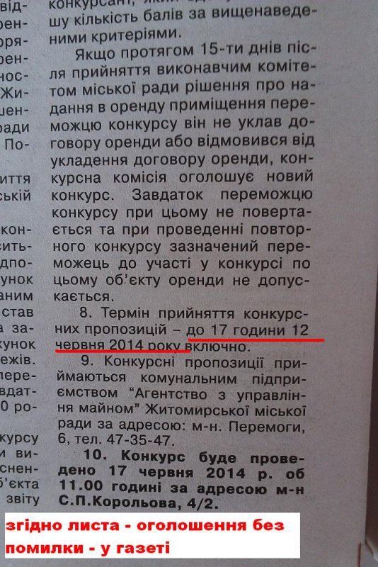 Пане Шуляр, у зазначеному оголошенні вказаний саме той, що потрібно, час прийняття конкурсних пропозицій, а саме – «до 17 години 12 червня 2014 року включно» (див. третій абзац знизу стор.8 № 22 газети «Місто» від 6 червня). А не 17 червня, чим ви ввели в оману членів виконкому. То хто кого підставив, пане Шуляр?