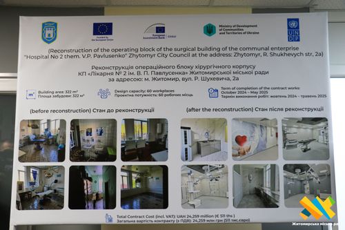 Відновлення перевершило очікування. Тепер операційний блок хірургічного корпусу КП «Лікарня №2 ім. В. П. Павлусенка» Житомирської міської ради відповідає всім міжнародним стандартам. Медичний заклад має сучасне обладнання та комфортні умови для надання якісної допомоги пацієнтам.
