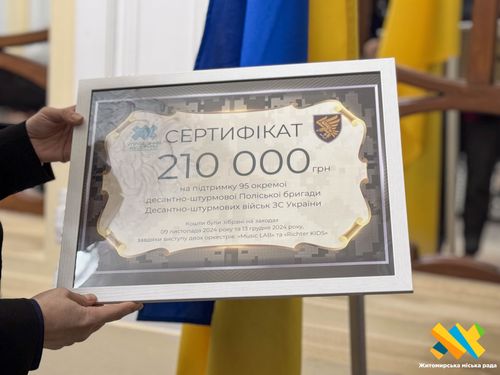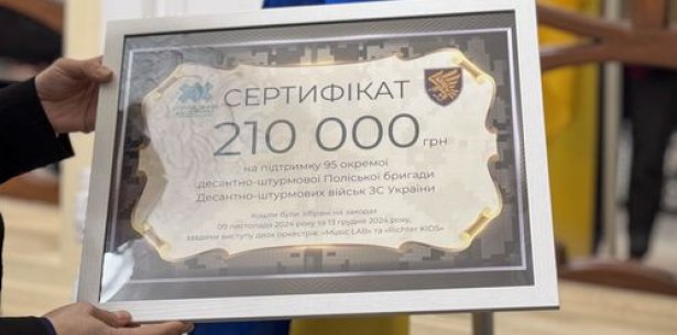 «За 2 благодійних концерти наших оркестрів, які відбулись 9 листопада та 13 грудня 2024 року, було зібрано 210 тисяч гривень для допомоги нашим Збройним Силам. Сьогодні ми передаємо зібрані кошти на допомогу нашій рідній 95 бригаді», – повідомляє начальниця Управління культури Ілона Колодій.