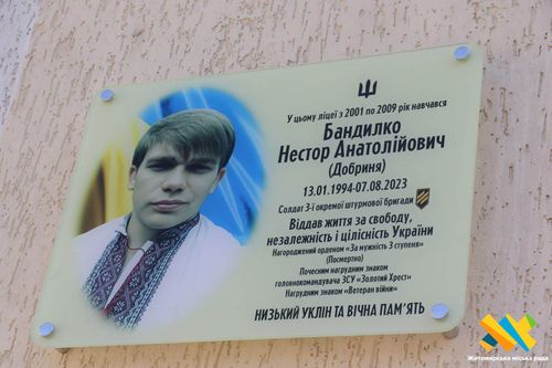 На стіні ліцею №17 у Житомирі відтепер навічно закарбоване ім’я Нестора Бандилка – солдата ІІІ окремої штурмової бригади, добровольця, патріота, який віддав життя за Україну. Він обрав шлях боротьби, став Воїном у 20 років...