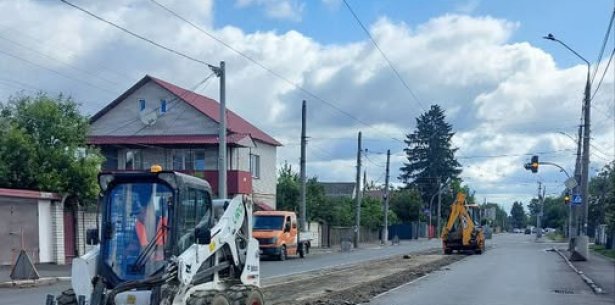 Наразі триває укладання дорожнього покриття між трамвайними коліями від вулиць Князів Острозьких та Хлібної до повороту на вулицю Небесної Сотні.