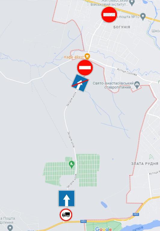 — рух автомобільного транспорту по Західному шосе здійснюватиметься в односторонньому напрямку від Чуднівського шосе у напрямку Богунії (до вул. Соснової);