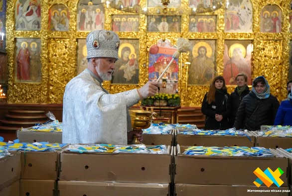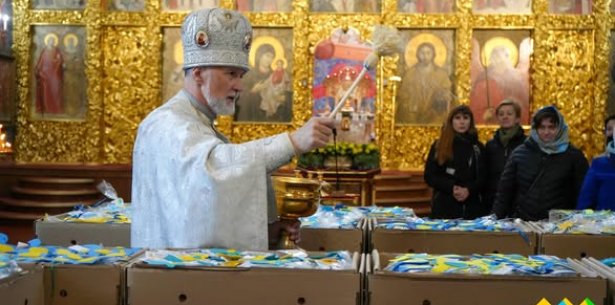 У Свято-Михайлівському кафедральному соборі освятили декілька тисяч великодніх пасок, які передадуть український воїнам на фронт та у лікарні для поранених Захисників та Захисниць. Разом із великоднім хлібом - малюнки, листи та символічні обереги.