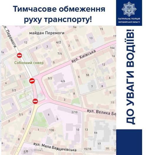 ➖ з вулиці Великої Бердичівської рух дозволено через вулиці Київська та Перемоги;
