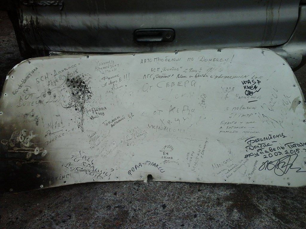 Машина находилась на Жуйка, на СТО, в ремонте. На панели, которая заменяла заднее стекло, мы обнаружили интересные отверстия, которых до этого не было. Похоже на пробои от дробовика. Эта панель в подписях наших бойцов. Сделали их , когда переехали с Артемовска - Дебальцево в Мариуполь. Именно этот автомобиль для наших бойцов более чем дорог, как память ...