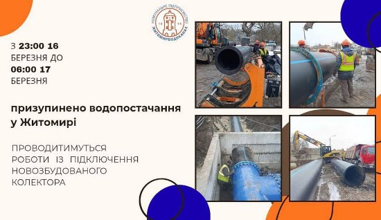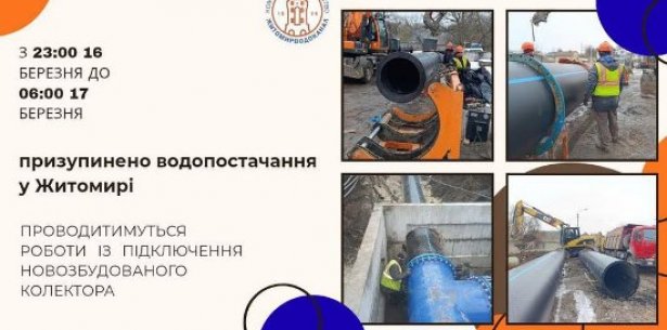 Сьогодні вночі бригади водоканалу проводитимуть роботи з підключення нового каналізаційного колектора. У зв’язку з цим у місті тимчасово буде відсутнє водопостачання з 23:00 16 березня до 06:00 17 березня.
